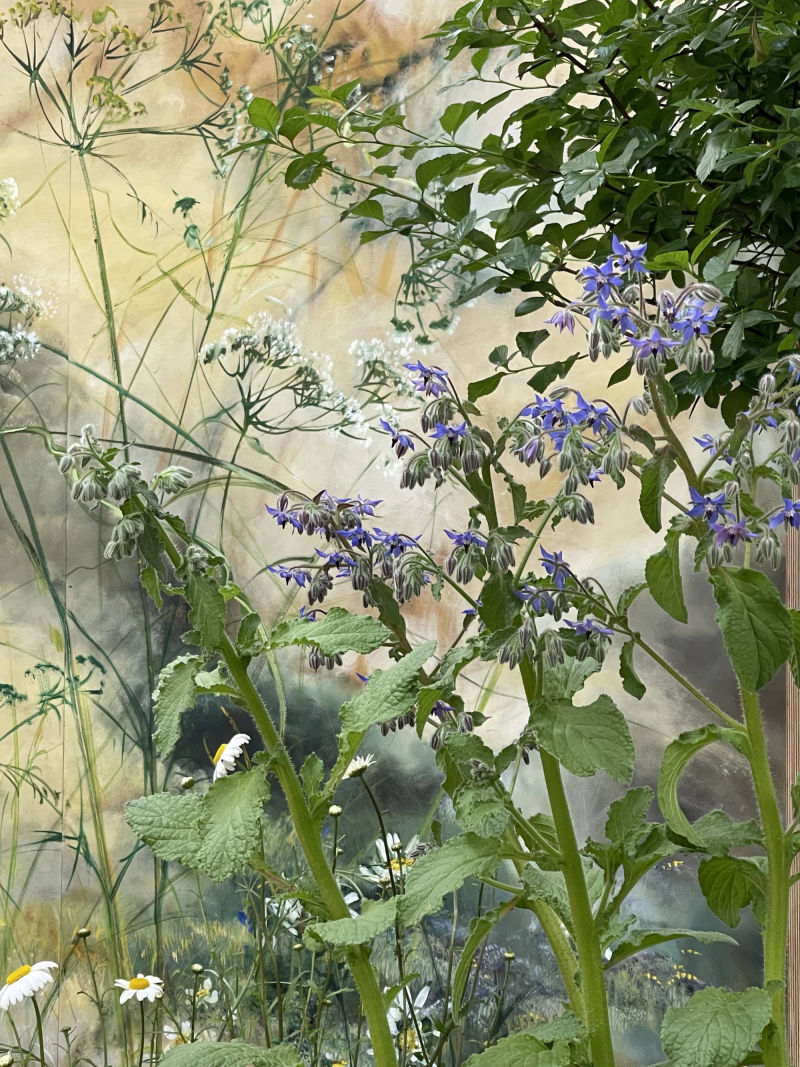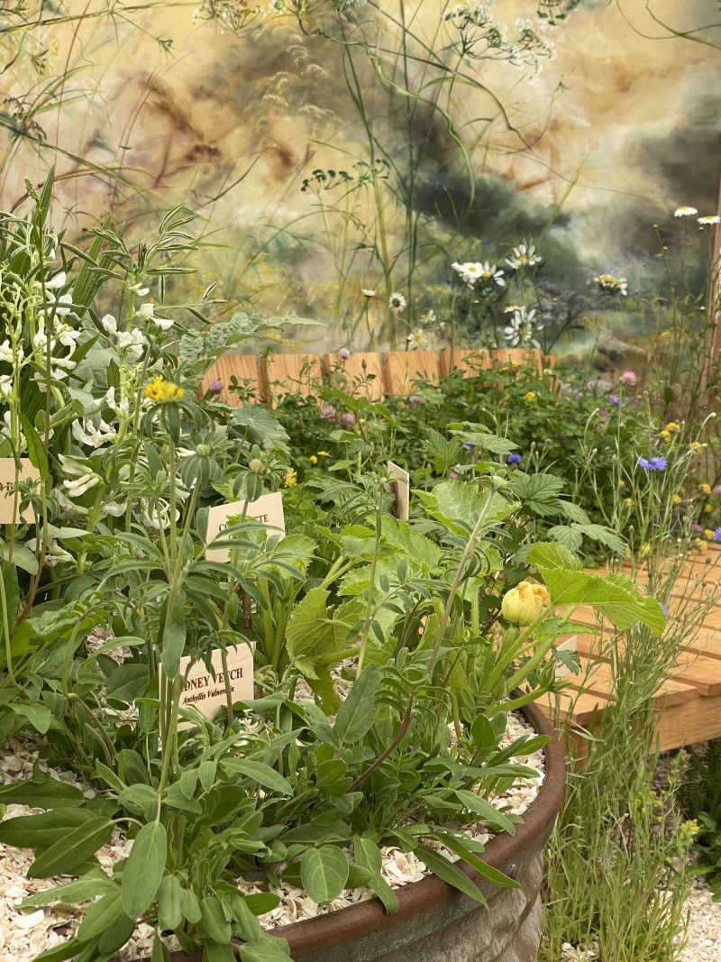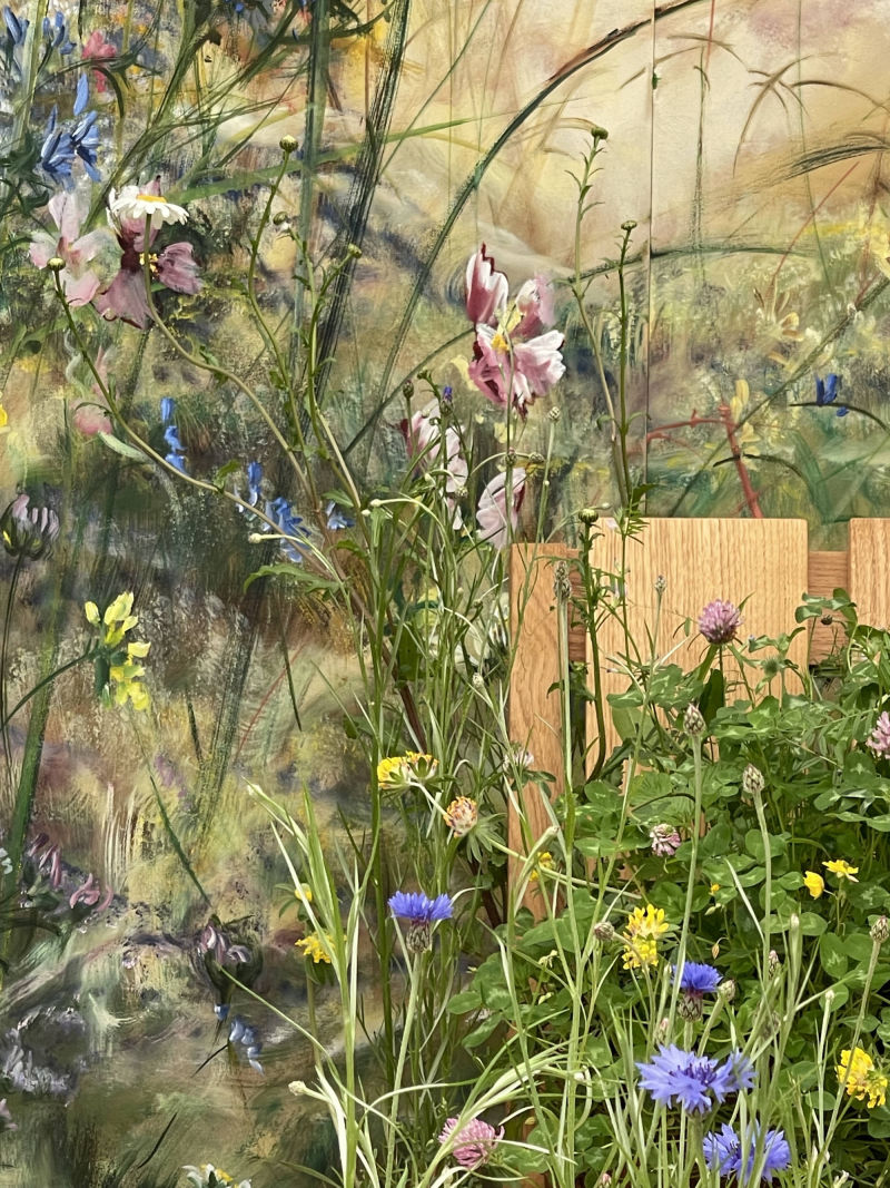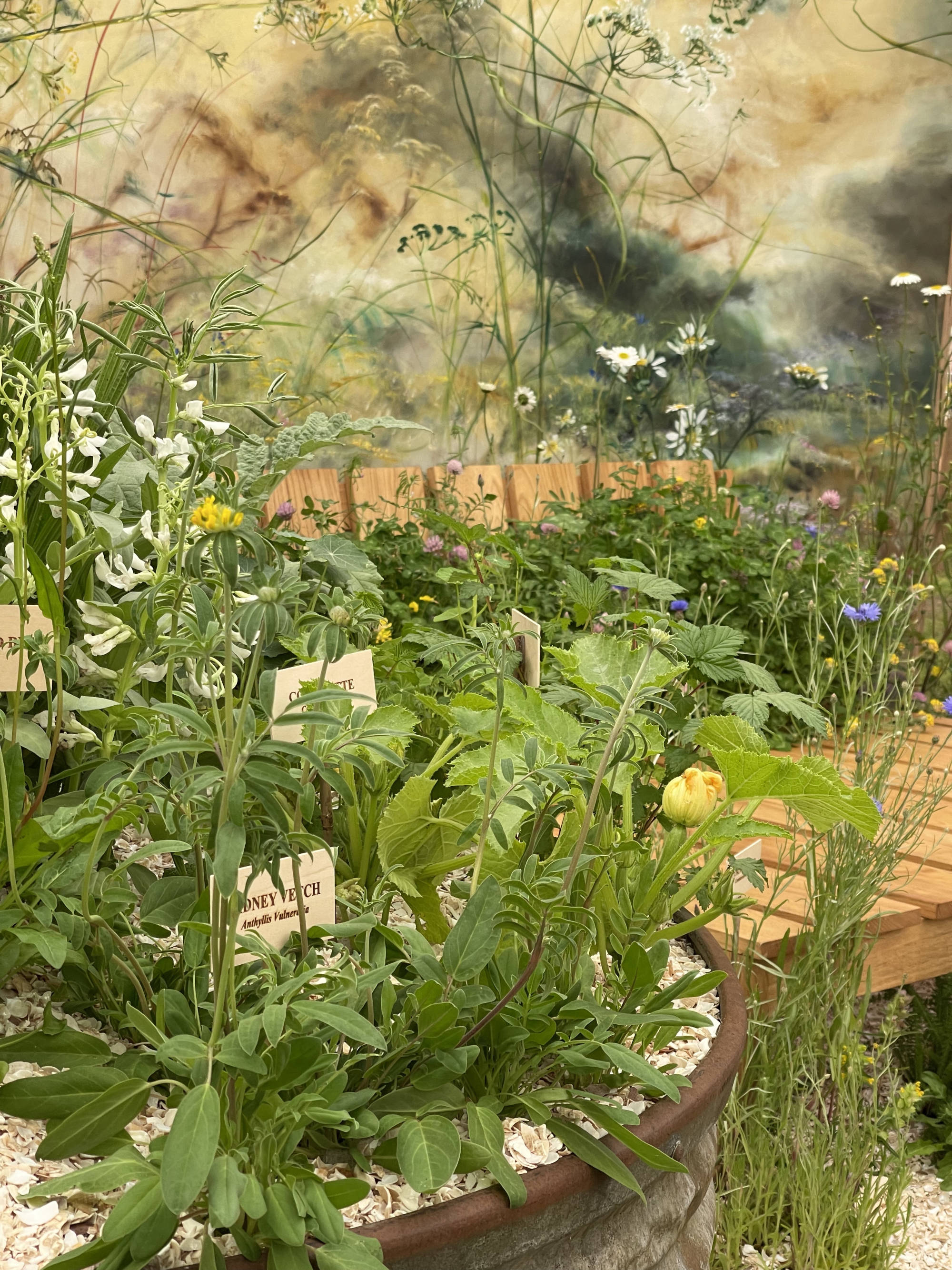 The beautiful Great Pavilion display, designed by Charlotte Denne of Kent Wildflower Seeds, in collaboration with garden designer, Tabi Jackson-Gee, and Lady Amelia Windsor, featured native wildflowers alongside a stunning large-scale artwork by French artist, Claire Basler (commissioned by organic perfumer designers Ffern) as well as gorgeous hand-designed shell pots by decorative artist Mel Campion, a bespoke reclaimed oak garden bench by Sebastian Cox, and recycled shell mulch by Shell on Earth.