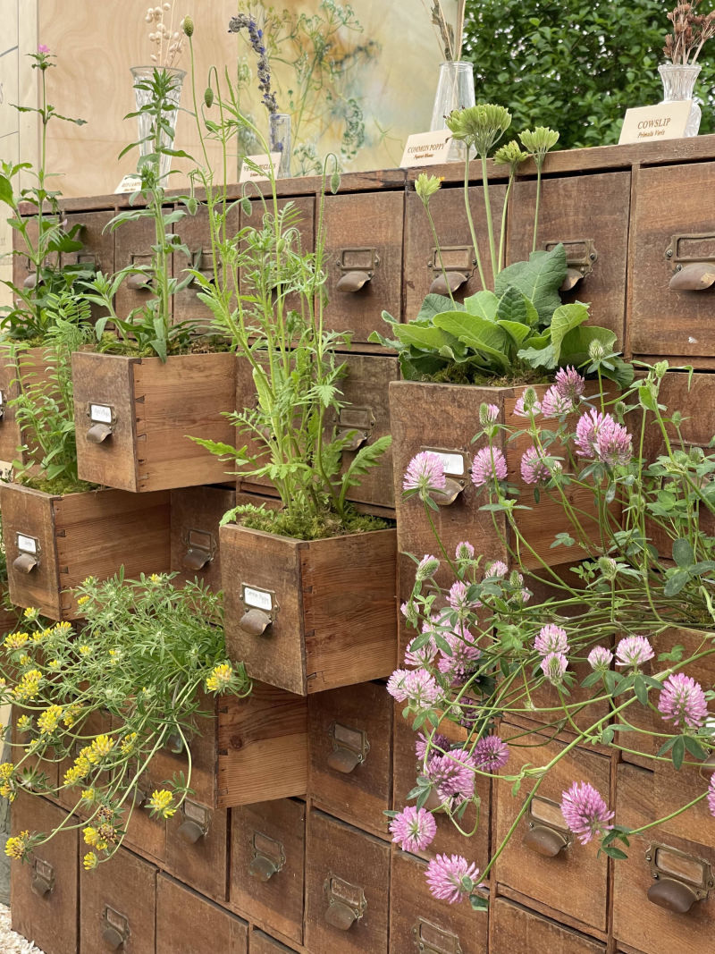 Displaying a kitchen garden container planting scheme, the display showed how to pair edimental and medicinal wildflowers with herbs and vegetables for a range of nutrient-rich edibles. The stand will also feature a set of antique seed drawers which were used in the family’s seed shop decades ago.