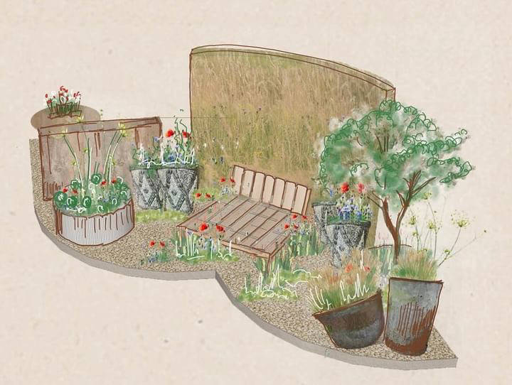 The beautiful Great Pavilion display, designed by Charlotte Denne of Kent Wildflower Seeds, in collaboration with garden designer, Tabi Jackson-Gee, and Lady Amelia Windsor, featured native wildflowers alongside a stunning large-scale artwork by French artist, Claire Basler (commissioned by organic perfumer designers Ffern) as well as gorgeous hand-designed shell pots by decorative artist Mel Campion, a bespoke reclaimed oak garden bench by Sebastian Cox, and recycled shell mulch by Shell on Earth.
